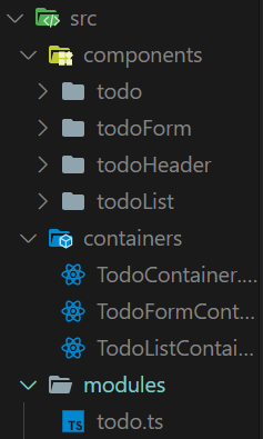 components ํด๋์๋ Presentational ์ปดํฌ๋ํธ๋ค์ด , containers ํด๋์๋ container ์ปดํฌ๋ํธ, ๊ทธ๋ฆฌ๊ณ modules ํด๋์๋ ๋ฆฌ๋์ค ๋ชจ๋์ ๋ฃ๋ ๊ตฌ์กฐ๋ก ์งํํ๋ค.