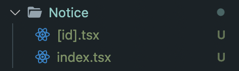 Notice๋ผ๋ ํด๋ ํ์์ index.tsx์ [id].tsx ๋๊ฐ์ ํ์ผ์ ์์ฑํ๋ค index.tsx๋ Notice์ Home์ด ๋ ๊ฒ์ด๊ณ [id].tsx๋ ์ฟผ๋ฆฌ๋ก ์ ๊ทผํ๋ ํ์ด์ง๊ฐ ๋ ๊ฒ ์ด๋ค.