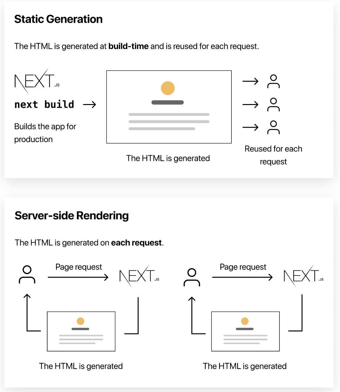 Next.js์๋ Static Generation, Server-side Rendering ๋๊ฐ์ง ํํ์ Pre-rendering ๋ฐฉ์์ ์ ๊ณตํ๋ค
